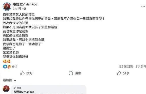 最近TVB那边可热闹了,有位35岁的女歌手谷娅溦,她现在是《中年好声音4》的常驻评委,昨天突然在自己的社交账号上发了一段话,没指名道姓,但明眼人一看就知道是在说某个所谓的“大师”。谷娅溦说这位“大师”老拿她当话题博眼球,她也是挺无奈的,直接喊话:“你要是每一集都盯着我看,我也没意见。”还带着点讽刺地说:“我也知道这年头混口饭吃不容易,要是说我能让你有饭吃,那我这也算是积德行善了!谢谢你啊!某某某老师,祝你以后越来越火!”